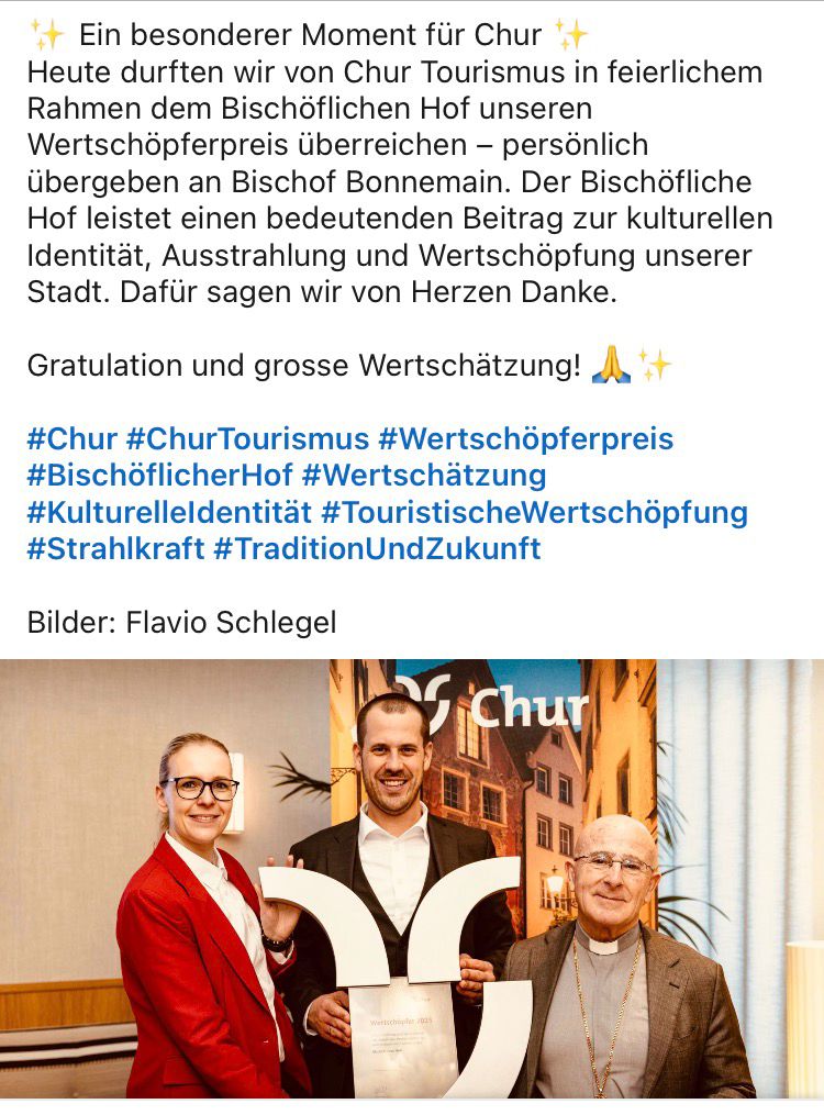 Heute durften wir von Chur Tourismus in feierlichem Rahmen dem Bischöflichen Hof unseren Wertschöpferpreis überreichen – persönlich übergeben an Bischof Bonnemain. Der Bischöfliche Hof leistet einen bedeutenden Beitrag zur kulturellen Identität, Ausstrahlung und Wertschöpfung unserer Stadt. Dafür sagen wir von Herzen Danke.