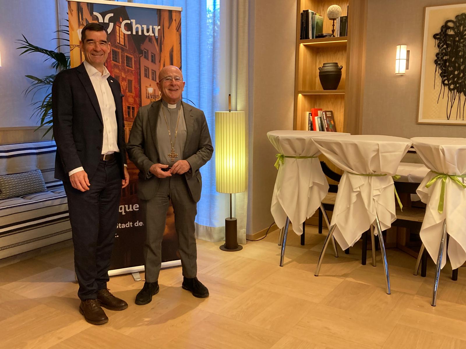 Unter Ihrer Leitung, verehrter Bischof Bonnemain, hat dieser Ort in den letzten Jahren neue Offenheit, Wärme und Strahlkraft gewonnen. Der Hof ist wieder ein lebendiger Ort der Begegnung – für die Churer Bevölkerung genauso wie für Gäste aus aller Welt. Besonders für Besucherinnen und Besucher aus anderen Kulturen ist es ein bleibendes Erlebnis, hier willkommen geheissen zu werden. Ihre persönliche Zugewandtheit hinterlässt tiefe Eindrücke und prägt das Bild Churs nachhaltig.