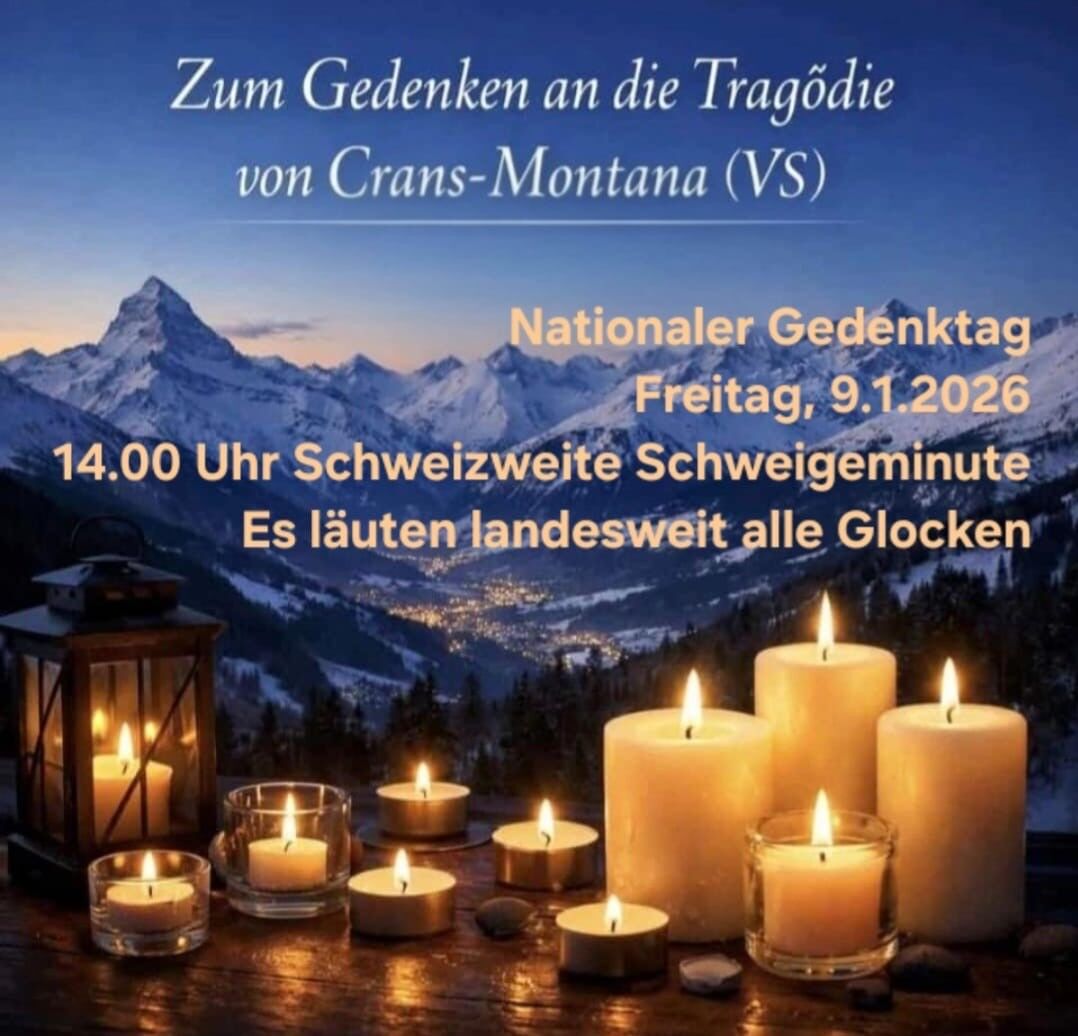 Um 14 Uhr am Freitag, 9. Januar, läuten die Kirchenglocken in der ganzen Schweiz. Alle sind gebeten, inne zu halten und den Opfern der Tragödie in Crans-Montana zu gedenken. 40 Todesopfer, mehr als 80 teils schwerst verletzte junge Menschen kämpfen immer noch um ihr Leben. Ihnen, ihren Familien und Angehörigen sowie allen Einsatz- und Rettungskräften, den in den nächsten Tagen und Wochen pflegenden Fachkräften und Ärzten gilt unser Mitgefühl, Respekt und Dank. Mögt ihr euch in diesen Minuten und darüber hinaus getragen und gestärkt fühlen.