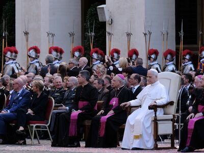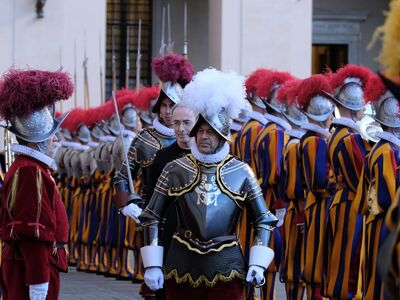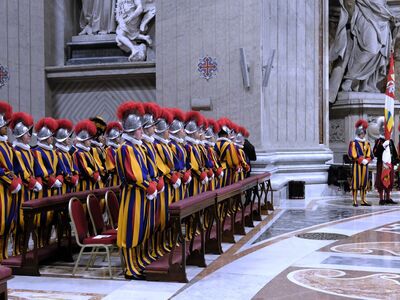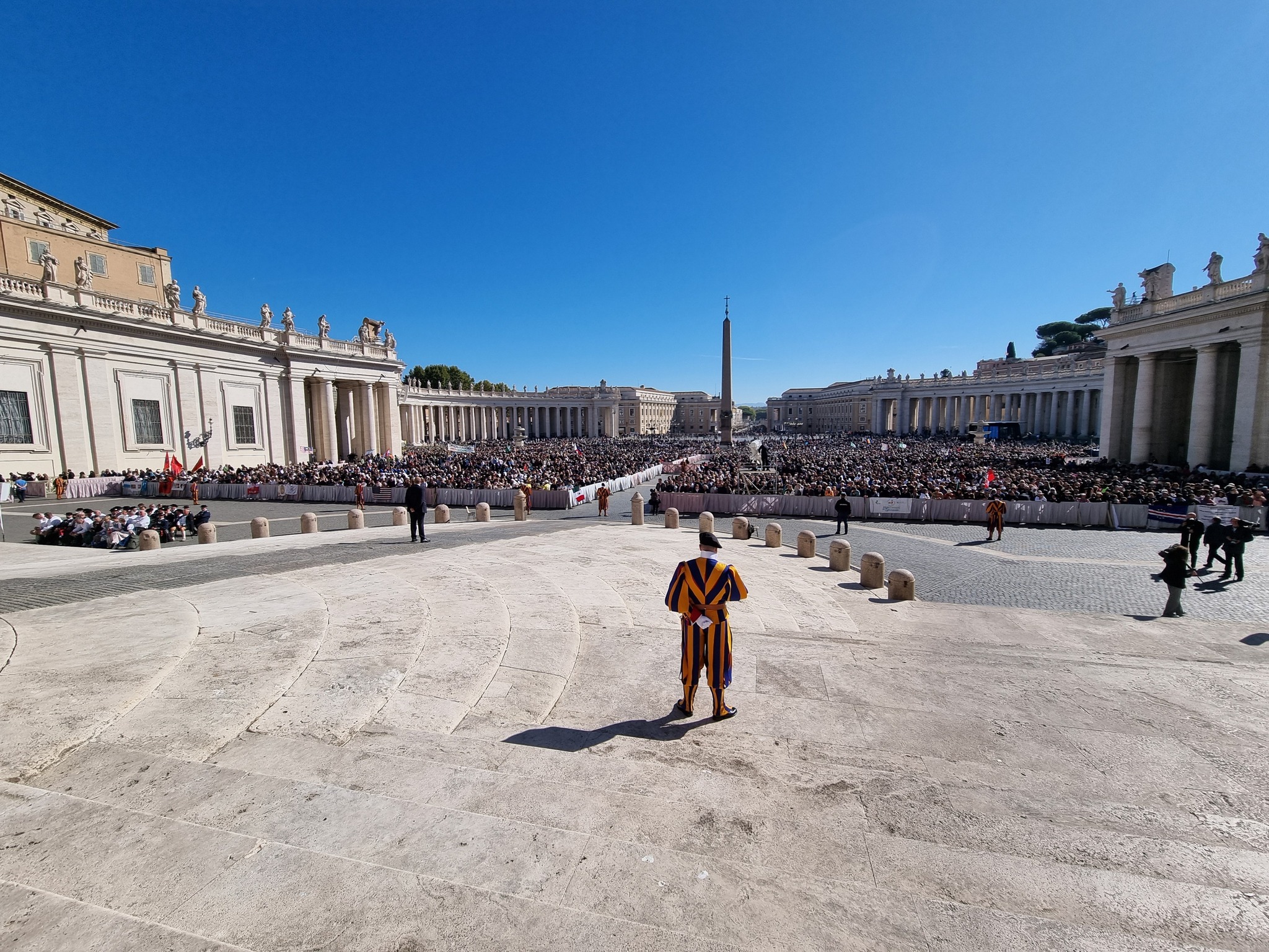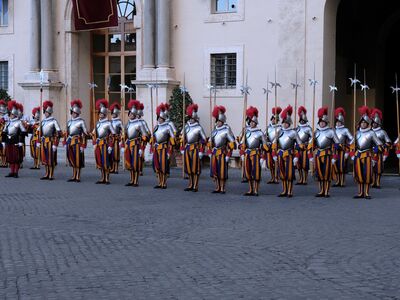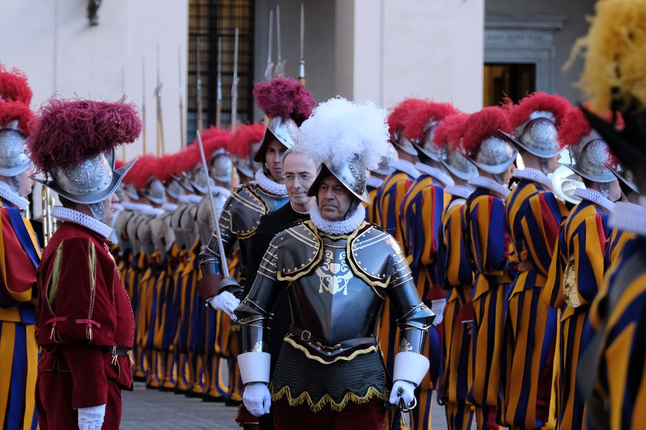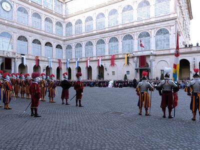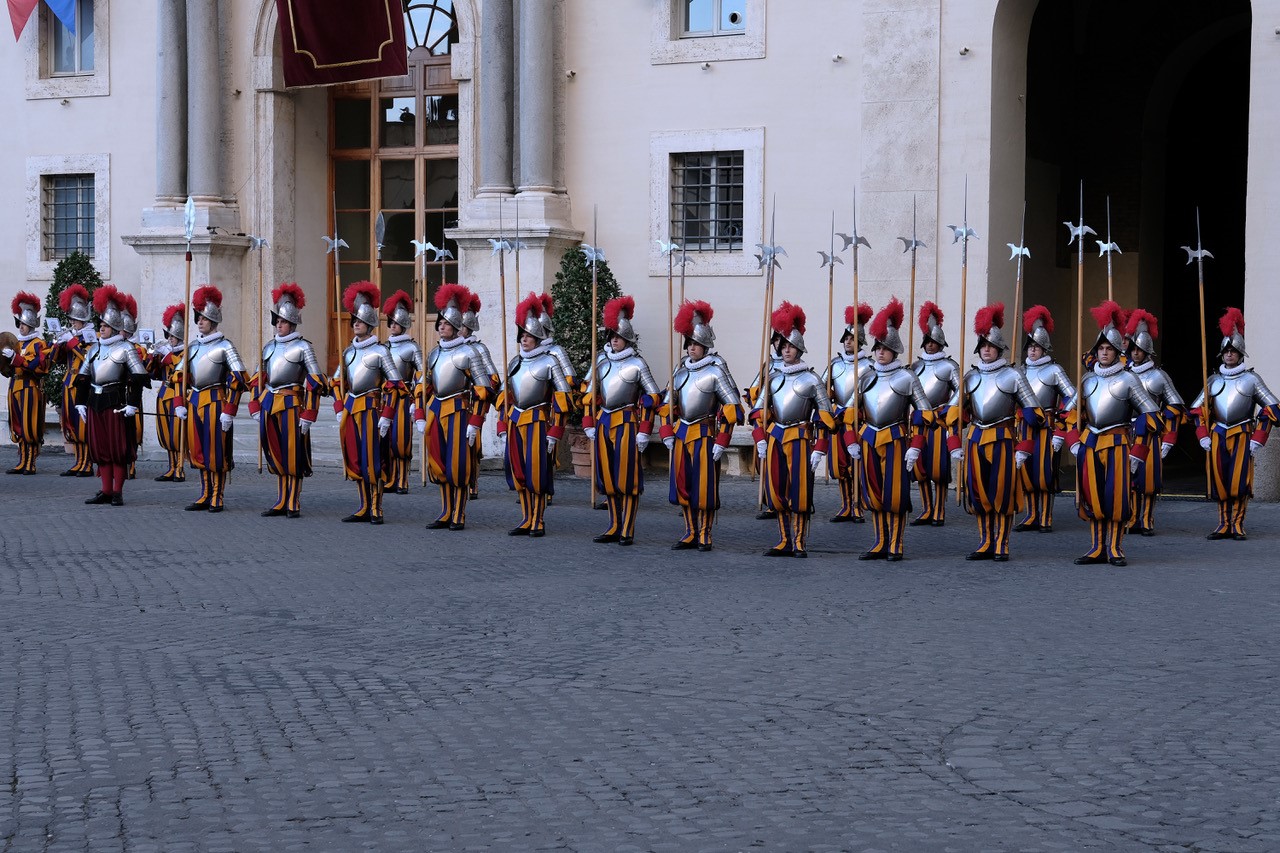 Für Garde, Familienangehörige und die offiziellen Delegationen aus Politik, öffentlichem Leben und der Kirche heisst die Teilnahme des Papstes: Neuorientierung, passt die Ansprache noch? Das Sicherheitsdispositiv? Hält der Drei-Wetter-Taft? Wobei, wie vom Heiligen Geist verweht, ist es heute in Rom windstill, während die letzten Tage fast schon die Statuen vom Petersdom weggefegt wurden. Eine kalte Biese dämpfte die Vorfreude der anreisenden Familien der Gardisten auf ein Wochenende im sonnigen Süden und etwas Himmelswärme.